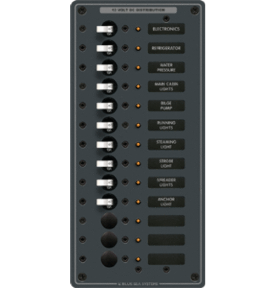 13 Positions(10) 15A Single Pole Circuit BreakersWhite SwitchesFeatures:All positive negative and grounding buses installed fully pre-wired Panels with meters include toggle switch for mounting up to 3 battery banks All panels with analog meters are owner upgradable to 24 Volts with 8240 or 8243 (18-32V DC meters) All circuit label positions are backlit on standard panels No kit required "ON" indicating LEDs installed in all circuit positions MIL-C-5541C or equivalent immersion undercoating for lifetime corrosion resistance Two-part polyurethane slate gray finish Heavy 1/8" aluminum 5052 alloy Industry standard height and width Countersunk mounting holes throughout Detailed installation instructions and cutout template included Includes set of 30 common Large Format Panel Labels Over 500 individual labels available WARNING: This product can expose you to chemicals including di(2-ethylhexyl)phthalate (dehp) which is known to the State of California to cause cancer birth defects or other reproductive harm. For more information go to P65Warnings.ca.gov.
