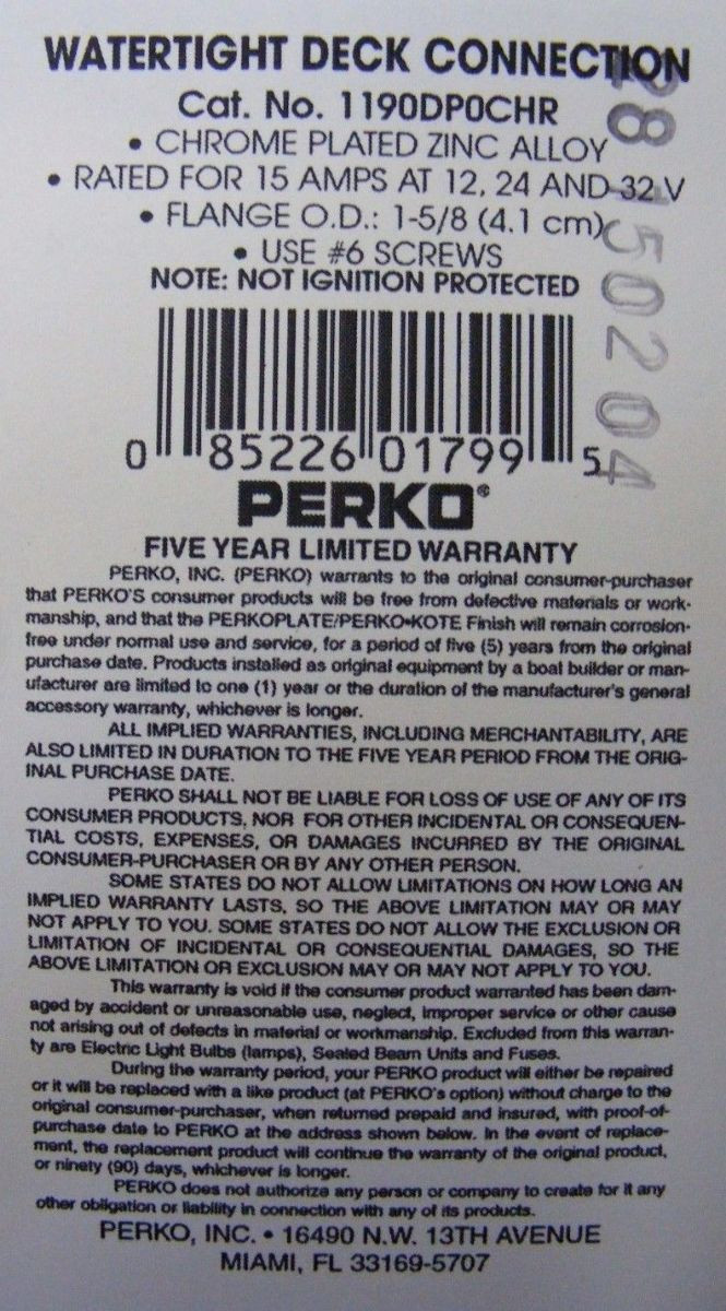 - Perko Watertight Deck Electrical Connection 2Pin 1-5/8Diam x 1-3/16H Boat Marine