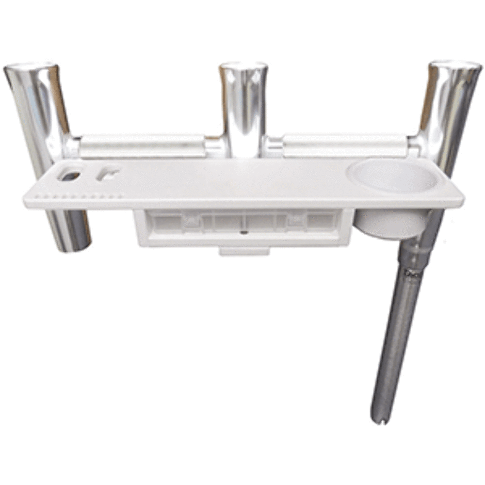 TACO's strong and durable high-polished aluminum 3-rod holder cluster with an offset is designed to maximize rod placement and usage on your boat. Great for kite fishing or as 3-rod holders in one. Fits all standard gunnel mounts and rod holders. Along with maximizing space a tool tray has been added to conveniently hold fishing tackle gear and a cup holder for beverages.